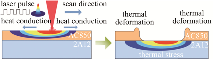 熱應(yīng)力耦合分析可以反映熱溫度場(chǎng)和應(yīng)力場(chǎng)的相互影響過程,根據(jù)求解步驟的不同, 分為直接求解法和間接求解法。直接求解法是利用包含溫度以及位移自由度的耦合單元,經(jīng)過一次求解計(jì)算同時(shí)得到熱分析和結(jié)構(gòu)應(yīng)力分析結(jié)果。間接求解法則需要分步進(jìn)行,首先通過熱分析計(jì)算出模型的節(jié)點(diǎn)溫度,將求解的節(jié)點(diǎn)溫度作為體載荷施加到結(jié)構(gòu)應(yīng)力分析中,求解出節(jié)點(diǎn)應(yīng)力。由于直接求解法的平衡狀態(tài)需要同時(shí)滿足多個(gè)準(zhǔn)則,復(fù)雜的約束條件使得節(jié)點(diǎn)自由度較多,并且矩陣方程繁雜,求解效率低。在鋁合金化銑保護(hù)膠激光刻型熱應(yīng)力耦合分析中,相較于結(jié)構(gòu)響應(yīng),熱分析的溫度對(duì)結(jié)構(gòu)分析時(shí)應(yīng)力應(yīng)變的影響更為顯著,因此本文中選擇效率較高的間接求解法來實(shí)現(xiàn)對(duì)鋁合金化銑保護(hù)膠激光刻型的熱應(yīng)力耦合分析。脈沖激光的刻蝕原理如圖 1所示,采用移動(dòng)高斯熱源模擬長(zhǎng)脈沖激光與目標(biāo)材料的相互作用過程。