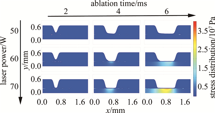 縱向觀察發(fā)現(xiàn),燒蝕時(shí)間恒定,燒蝕深度隨著激光功率的增大逐漸增大,同時(shí),燒蝕區(qū)域底部對(duì)應(yīng)的保護(hù)膠與鋁合金的結(jié)合界面處出現(xiàn)了應(yīng)力集中現(xiàn)象,而應(yīng)力集中點(diǎn)也隨著激光功率的增大而顯著增多;其中燒蝕時(shí)間為4 ms6 ms,激光功率為60 W70 W時(shí),保護(hù)膠與鋁合金的結(jié)合界面處開始出現(xiàn)應(yīng)力集中現(xiàn)象,且應(yīng)力集中區(qū)隨著激光掃描路徑延伸逐漸擴(kuò)大,應(yīng)力至高點(diǎn)出現(xiàn)在掃描區(qū)域的中心位置,且對(duì)鋁合金基體材料產(chǎn)生了應(yīng)力影響。橫向觀察發(fā)現(xiàn),激光功率為50 W時(shí),整個(gè)燒蝕過程中沒有出現(xiàn)特別明顯的應(yīng)力集中區(qū),這是因?yàn)榧す夤β瘦^小時(shí),保護(hù)膠材料不能被完全燒蝕,所以保護(hù)膠與鋁合金的結(jié)合界面處并未產(chǎn)生明顯應(yīng)力;同燒蝕深度的變化規(guī)律,其應(yīng)力影響區(qū)域面積與應(yīng)力數(shù)值也隨著激光功率的增大而增大。仿真計(jì)算結(jié)果表明:激光功率越大,燒蝕深度越深;激光焦點(diǎn)距保護(hù)膠與鋁合金的結(jié)合界面處越近,界面處產(chǎn)生的應(yīng)力就越大,由于鋁合金是熱的良導(dǎo)體,較高的傳熱性能使其在激光刻型時(shí),容易產(chǎn)生更大范圍的應(yīng)力區(qū)域與更高的應(yīng)力值。