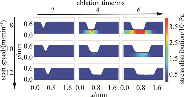3是以激光掃描速率為變量的仿真結(jié)果。分別選取8 m/min, 10 m/min, 12 m/min為參數(shù)節(jié)點(diǎn),其余仿真條件如下:激光功率為60 W、重復(fù)頻率為100 kHz。燒蝕時(shí)間節(jié)點(diǎn)選擇與圖例設(shè)置同圖 2。橫向觀察發(fā)現(xiàn),較10 m/min, 12 m/min的仿真結(jié)果,激光掃描速率為8 m/min時(shí),其燒蝕深度較深,且整個(gè)燒蝕過程中產(chǎn)生的應(yīng)力區(qū)域較大、應(yīng)力值較高,而燒蝕深度、應(yīng)力區(qū)域和應(yīng)力極值均與掃描速率呈負(fù)相關(guān)。因?yàn)閽呙杷俾实脑龃髸?huì)造成激光燒蝕過程中脈沖重疊率的減小,從而降低了激光加工過程中的熱效應(yīng)累積,同時(shí)也減少了熱應(yīng)力的集中現(xiàn)象。