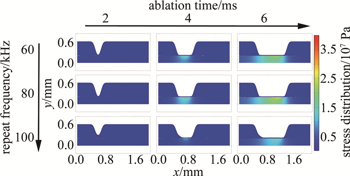 4是以激光重復(fù)頻率為變量的仿真結(jié)果。選取60 kHz, 80 kHz, 100 kHz為參數(shù)節(jié)點(diǎn),其余仿真條件如下:激光功率為60 W、掃描速率為10 m/min。燒蝕時(shí)間節(jié)點(diǎn)選擇與圖例設(shè)置同圖 2。觀察發(fā)現(xiàn), 激光重復(fù)頻率為60 kHz, 80 kHz時(shí),燒蝕過程中產(chǎn)生的應(yīng)力區(qū)域與應(yīng)力值差別較小但顯著大于重頻為100 kHz時(shí)的情況。3種重頻下的燒蝕深度并無明顯差別,說明在激光功率與掃描速率相同的情況下,脈沖激光的重復(fù)頻率對(duì)燒蝕效果的影響并不顯著,但卻會(huì)帶來燒蝕過程中應(yīng)力的變化,這對(duì)調(diào)整激光加工工藝有重要的指導(dǎo)意義。