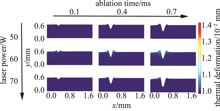 6為不同激光功率對(duì)保護(hù)膠刻型形貌的影響示意圖。以激光功率為變量,分別選取50 W, 60 W, 70 W為參數(shù)節(jié)點(diǎn),根據(jù)激光燒蝕時(shí)間選擇3個(gè)時(shí)間節(jié)點(diǎn)分別為0.1 ms, 0.4 ms, 0.7 ms。在9個(gè)仿真結(jié)果中,材料因熱應(yīng)力而產(chǎn)生的位移通過顏色圖例顯示,至高為1.4×10-2 mm,低為0.98×10-2 mm