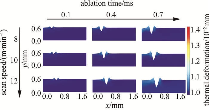 7是以掃描速率為變量的仿真結(jié)果。分別選取8 m/min, 10 m/min, 12 m/min為參數(shù)節(jié)點(diǎn),其余加工參數(shù)如下:激光功率為60 W、重復(fù)頻率為100 kHz。燒蝕時(shí)間節(jié)點(diǎn)選擇與圖例設(shè)置同圖 6。觀察圖 7發(fā)現(xiàn),掃描速率為8 m/min時(shí),保護(hù)橡膠產(chǎn)生的熱變形較大。這是因?yàn)閽呙杷俾实脑龃髸?huì)引起脈沖重疊率的減小,且會(huì)明顯降低激光刻型過程中熱效應(yīng)的累積現(xiàn)象,同時(shí)也會(huì)減小切口的熱變形程度。