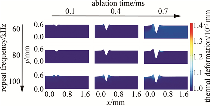 8是以重復(fù)頻率為變量的仿真結(jié)果。分別選取60 kHz80 kHz100 kHz為參數(shù)節(jié)點(diǎn), 其余仿真條件如下:激光功率為60 W、掃描速率為10 m/min。燒蝕時(shí)間節(jié)點(diǎn)選擇與圖例設(shè)置同圖 6。觀察圖 8發(fā)現(xiàn),掃描時(shí)間恒定時(shí),重復(fù)頻率以選取的參數(shù)節(jié)點(diǎn)變化; 重復(fù)頻率為60 kHz80 kHz時(shí),切口形貌、燒蝕深度無明顯變化,當(dāng)重復(fù)頻率達(dá)到100 kHz時(shí),形貌變化較明顯,且切口處產(chǎn)生了較大的熱變形現(xiàn)象。