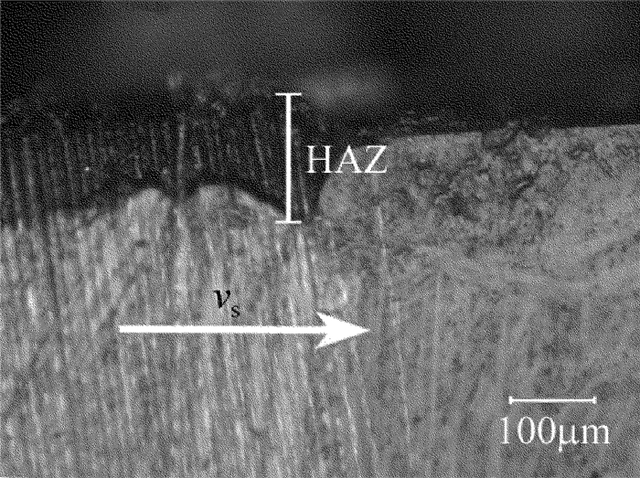 10為掃描次數對掃描深度及熱影響區的影響規律,由圖可以看出,掃描深度隨著掃描次數的增加呈非線性增加,當掃描次數較少時,掃描深度增加得快,當掃描次數較多時,掃描深度增加得慢。這主要是因為隨著掃描次數的增加和切縫深度的增加,進入切縫內材料表面的激光能量越少,同時,隨著切縫深度的增加氣化的材料更難從切縫中飛濺出來,導致掃描深度的增加速度明顯減緩。熱影響區隨著掃描次數的增加有明顯的減小,主要是因為隨著掃描次數的增加,激光能量反復作用于切縫兩側的材料,之前熱影響區中的材料被進一步氣化去除掉,導致熱影響區明顯減小。由圖可以得出,在重復掃描次數為20時,熱影響區僅為10μm,材料去除深度為40μm左右,既可以得到較好的邊緣質量也能得到較高的去除效率。