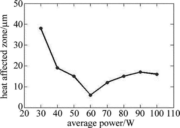 5是當重復頻率為0.4MHz、掃描速率為10m/s時,平均功率與熱影響區的關系。由圖 5可以看出,當平均功率增加時,熱影響區逐漸減小,隨著平均功率的繼續增加,熱影響區逐漸增大,最后趨于穩定。由于在重復頻率、掃描速率不變時,隨著平均功率的增加,單脈沖能量也增大,達到材料燒蝕閾值的能量也更多,激光脈沖能量更有效地用于CFRP的去除,有利于提高單脈沖能量的利用率,使得熱損傷相應的減小,從而熱影響區減小。然而,當功率過高時,去除材料后剩余的能量也越多,導致能量的積累越多,使得熱損傷相應的增加,從而熱影響區增大。由圖 5可知,當平均功率為60W時,此時熱影響區小,約為5μm