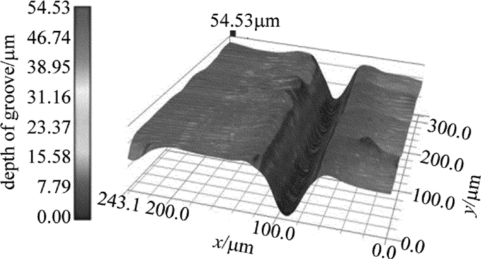 為了得到合適掃描深度,探究了循環掃描次數對掃描深度的影響規律,在上述實驗的基礎上選擇合適的工藝參量:平均功率60W、重復頻率0.4MHz、掃描速率10m/s,選取循環掃描次數分別為3, 5, 10, 20, 50, 100進行實驗,通過超景深3維顯微鏡來測量其掃描深度和寬度。圖 9為掃描次數為20時切縫微觀形貌的分層設色圖。圖中顏色由灰色向黑色過渡表示掃描深度的增加,黑色表示掃描深度較大,由圖可以看出,此時掃描寬度為50μm左右,深度約為40μm