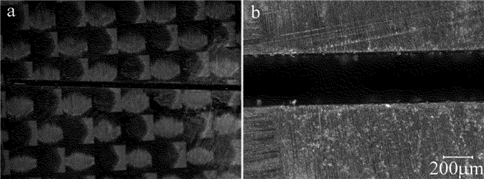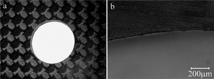 11a和圖 12a分別是在優化工藝參量下對1.5mm厚碳纖維板進行直線、圓孔切割的實驗結果;圖 11b和圖 12b分別是對切割后直線、圓孔邊緣放大圖。從圖 11和圖 12可以看出,切縫邊緣表面沒有纖維拔出現象,也沒有明顯的熱影響區,得到較好的切割質量。