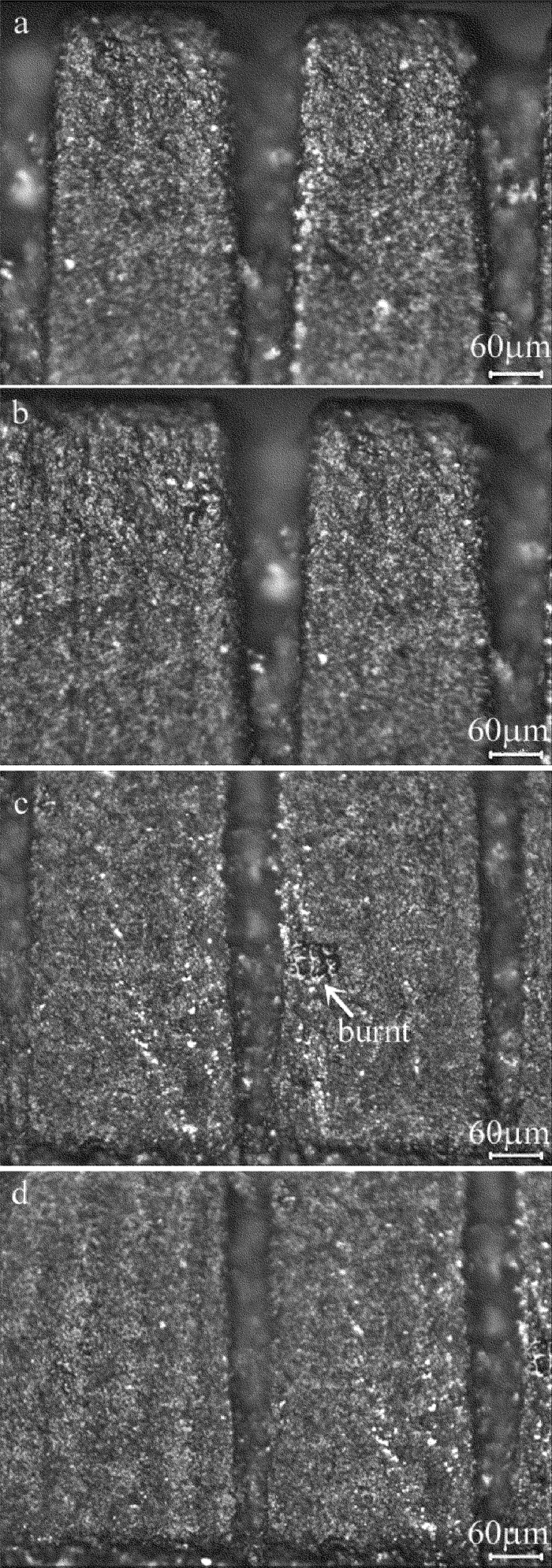 進行工藝試驗時,采用打孔方式來計算得出PCBN在該條件下的燒蝕閾值,通過切割試驗獲得各切割參量對切割質量的影響。實驗完成后,采用MV6000金相顯微鏡對切縫表面和側面進行測量和分析。